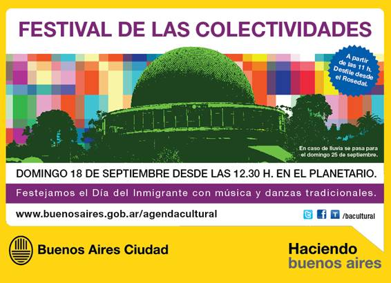 La Dirección General de Relaciones Institucionales del Gobierno de la Ciudad Autónomade Buenos Aires festeja y agasaja a los Inmigrantes con un gran Festival de las Colectividades que hacen e hicieron tanto por nuestro país. El Festival de las Colectividades se llevará a cabo el domingo 18 de Septiembre en el Parque 3 de Febrero (Jardines del Planetario de la Ciudad) entre las 11 y las 18 horas. Este evento se suspende por lluvia para el 25 de septiembre.